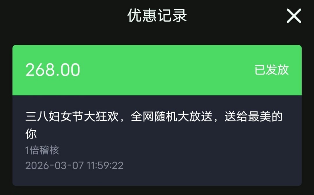 在2月1日至3月6日期间充值过100登入上系统自动派发,一倍流水取款,仅限女性用户