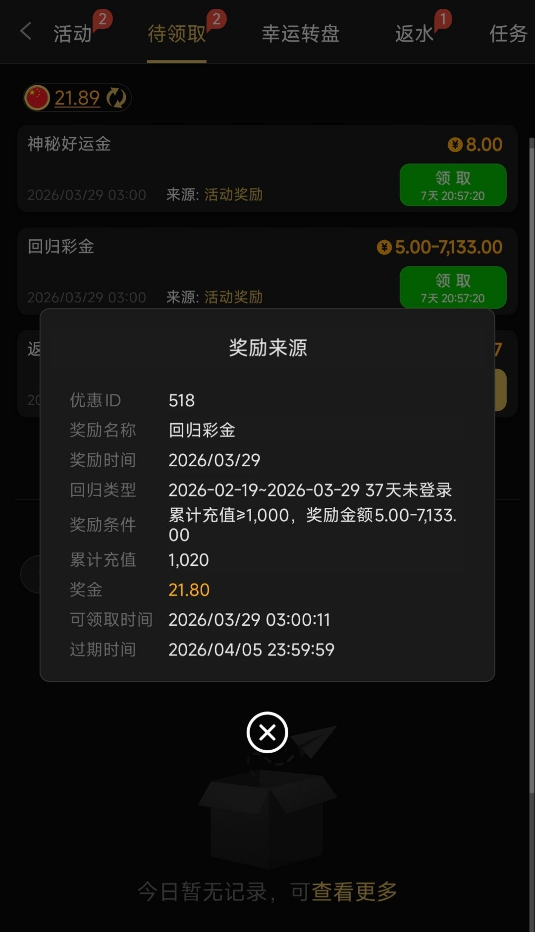 有账号充值大于1000以上并且长期未登入,符合的老哥可以登入上账号到优惠-待领取页面领取回归彩金,彩金多少具体看历史存款金额