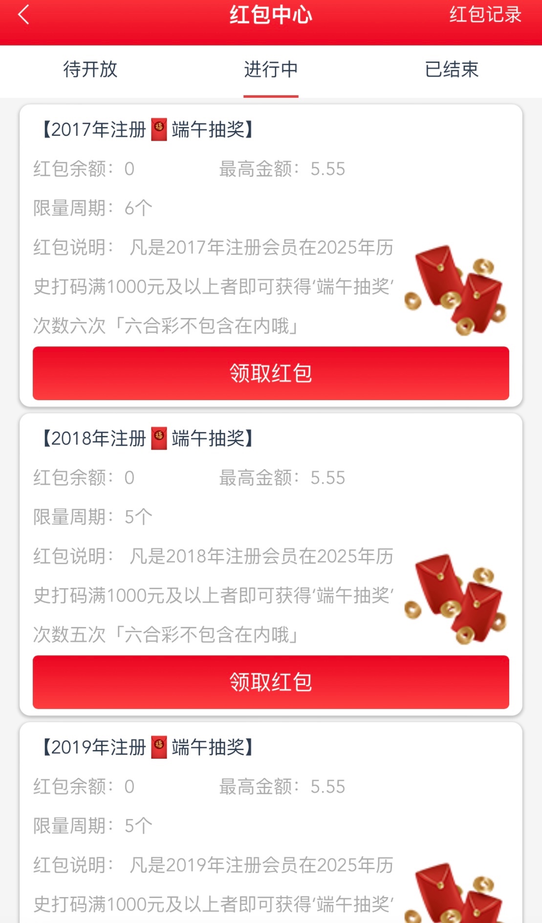 登录后点我的在点领取福利,根据自己注册的年份抽红包,需历史满1000投注才可以抽取,符合的记得去抽
