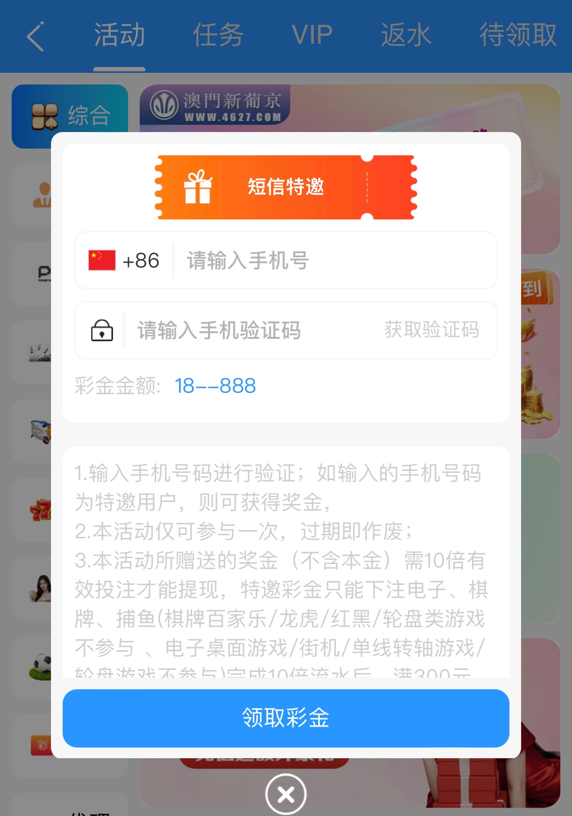 注册完善资料活动里获取验证码自助领取,彩金10倍流水,仅限:电子/捕鱼/棋牌,盈利满300后使用USTD或任意数字钱包取款,彩金最高取款500